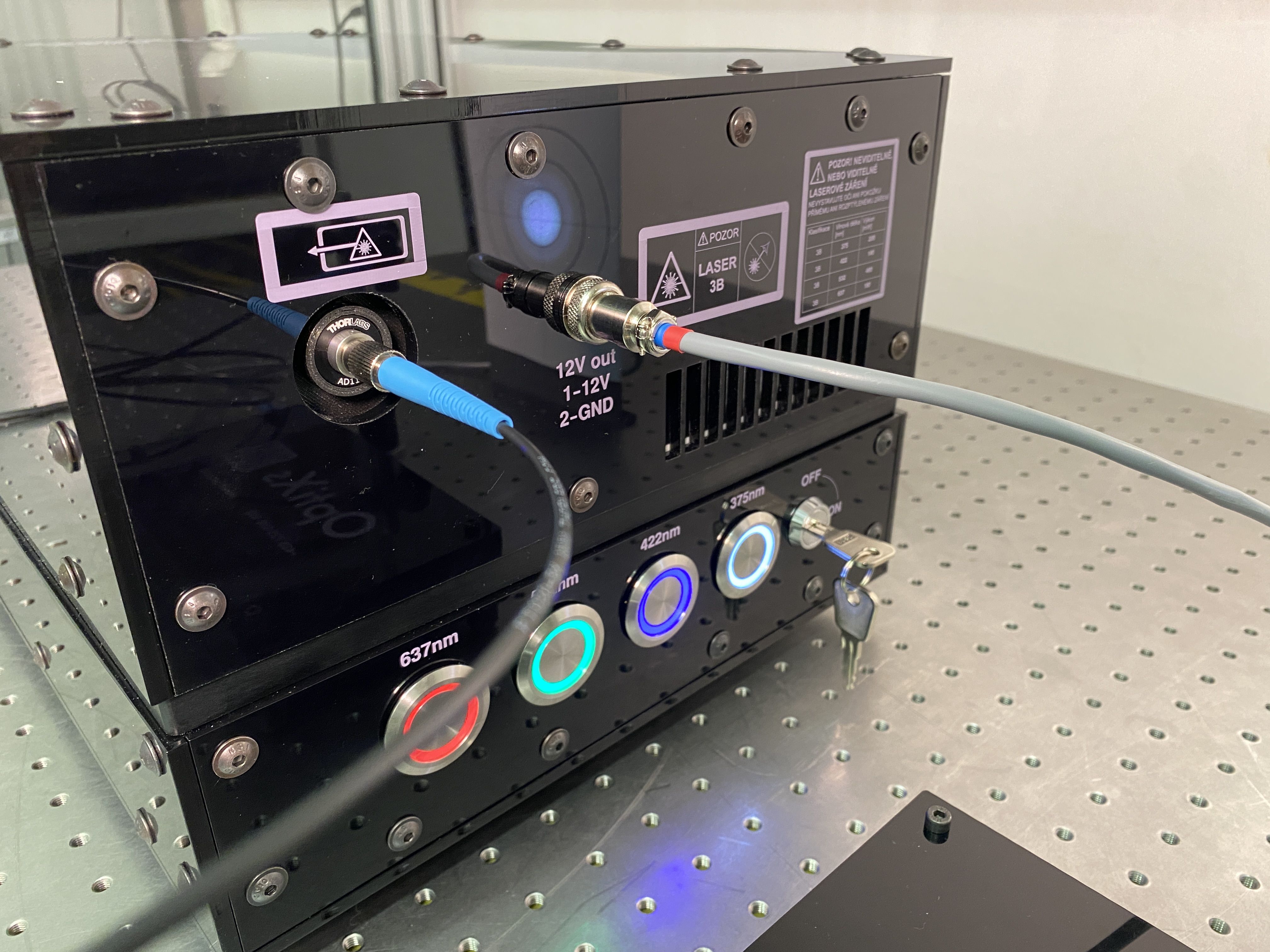 interlockovým konektorem a tlačítky umožňujícími individuální zapínání/vypínání laserů. Správu laserů (např.