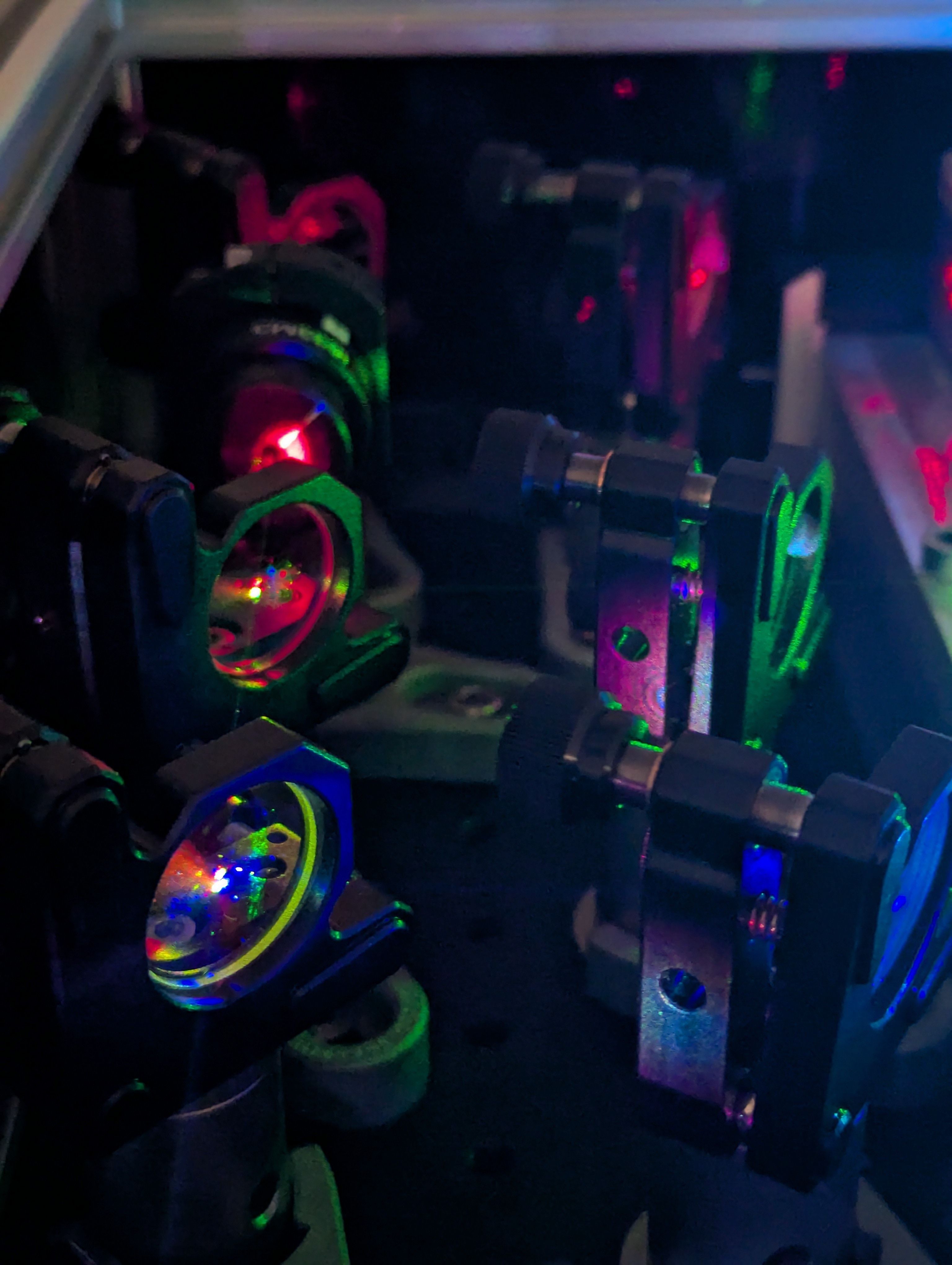 výroby beam combineru. Použity byly diodové lasery s relativně vysokými výkony (> 100 mW pro 3 ze 4 vlnových délek),