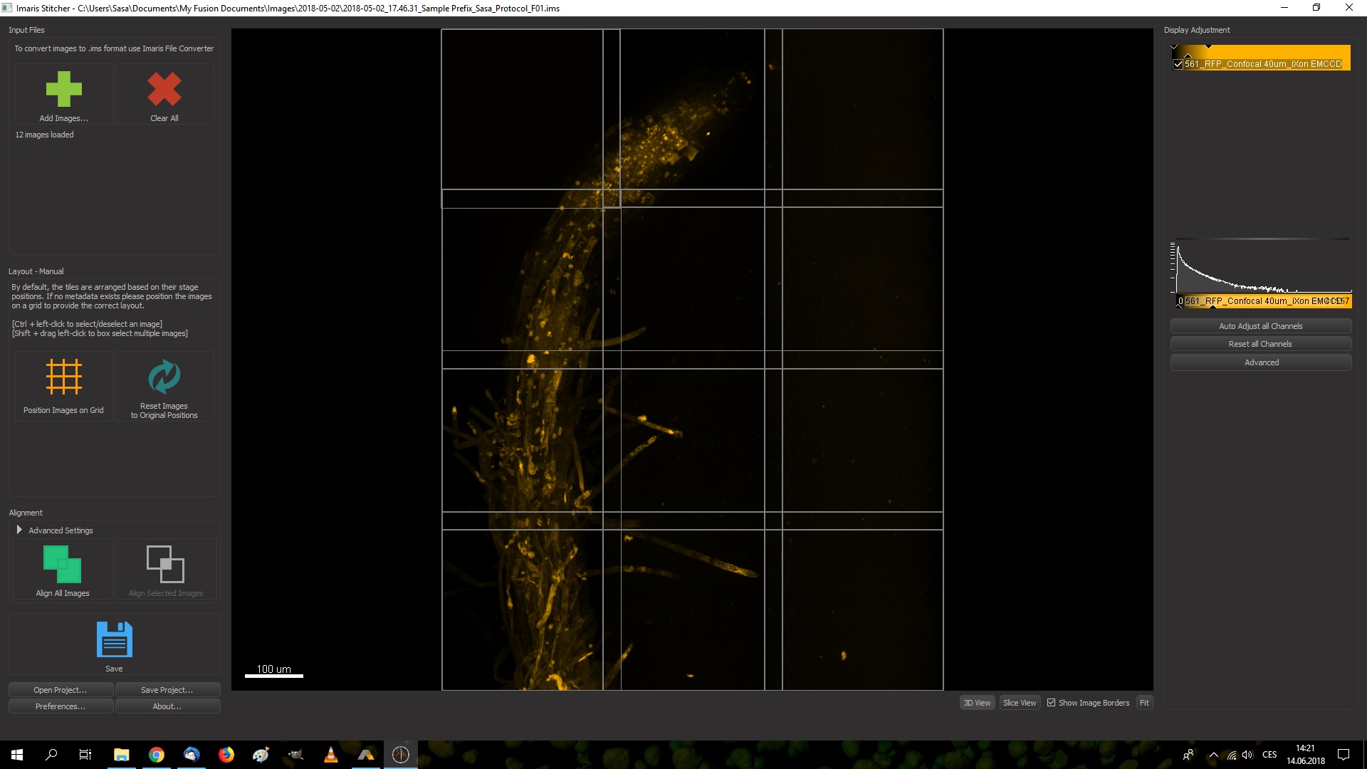 Obrázek 2.: Kořen semenáčku houseníčku (Arabidopsis) obarvený propidium iodidem (PI) , Andor Dragonfly, iXon, 40x, Oil, NA: 1.3, Voxel 0.301 * 0.301 * 0.278 um, X/Y: 1024*1024 pixelů, Z: 154. Imaris Stitcher - 12 plných rozných polí před spojením. Vzorky poskytla Anna Nowicka z ÚEB, Olomouc, Česká republika.