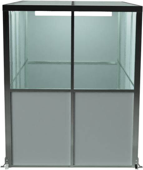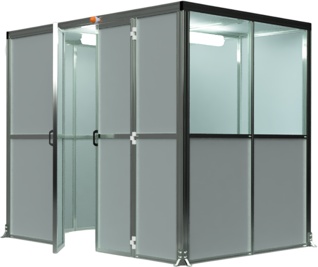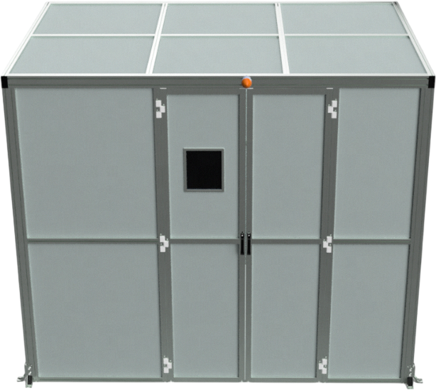 Buňka je zkonstruována z hliníkových profilů a plechů s matným černým lakem zajišťujícím pohltivost. Snadný přístup pro obsluhu i návoz materiálu zajišťují široké dvoukřídlé dveře. Celý systém je navíc projektován jako modulární, takže již v základním provedení počítá s variabilními prostupy pro kabeláž, chladicí hadice či technologické vstupy, které připravíme přesně podle specifikací vašeho zařízení.
