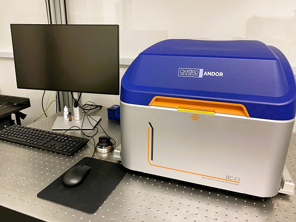 Multi-modální stolní konfokální mikroskop BC43 od firmy Andor s kompaktními rozměry, zabudovanou antivibrační platformou a těsným, neprůhledným krytem.
