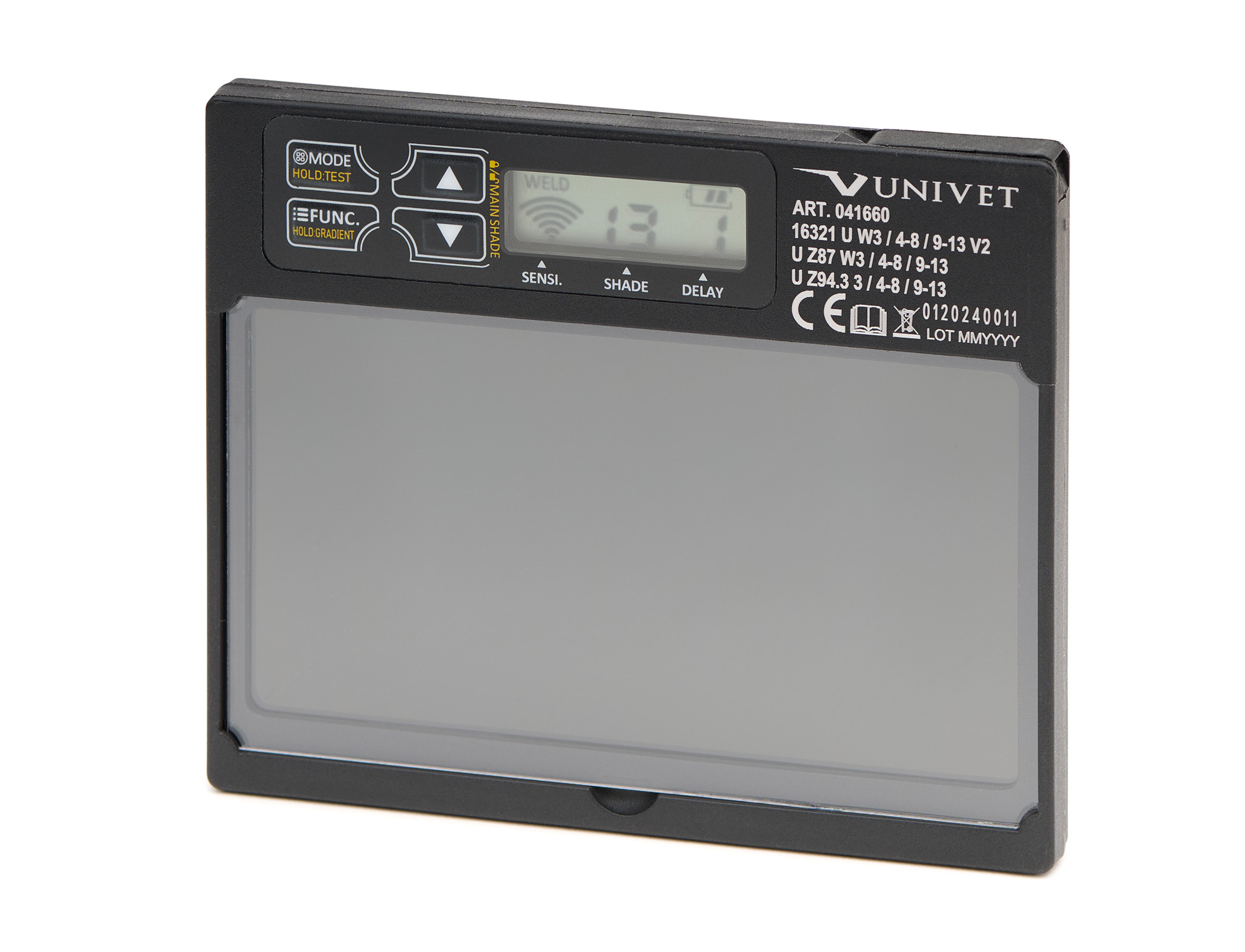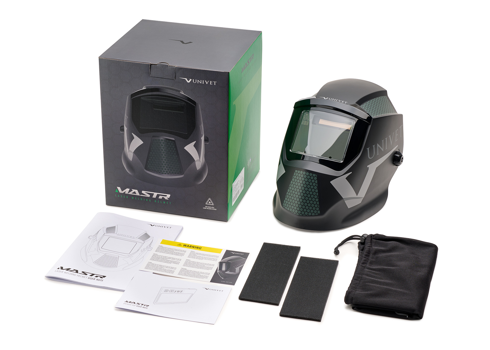 Součástí dodávky je ochranná kukla Univet MASTR s instalovaným laserovým filtrem a ADF kazetou, ochranný obal pro skladování, náhradní přední ochranný zorník, čisticí utěrka, certifikační karta s technickými parametry filtru a návod k použití.